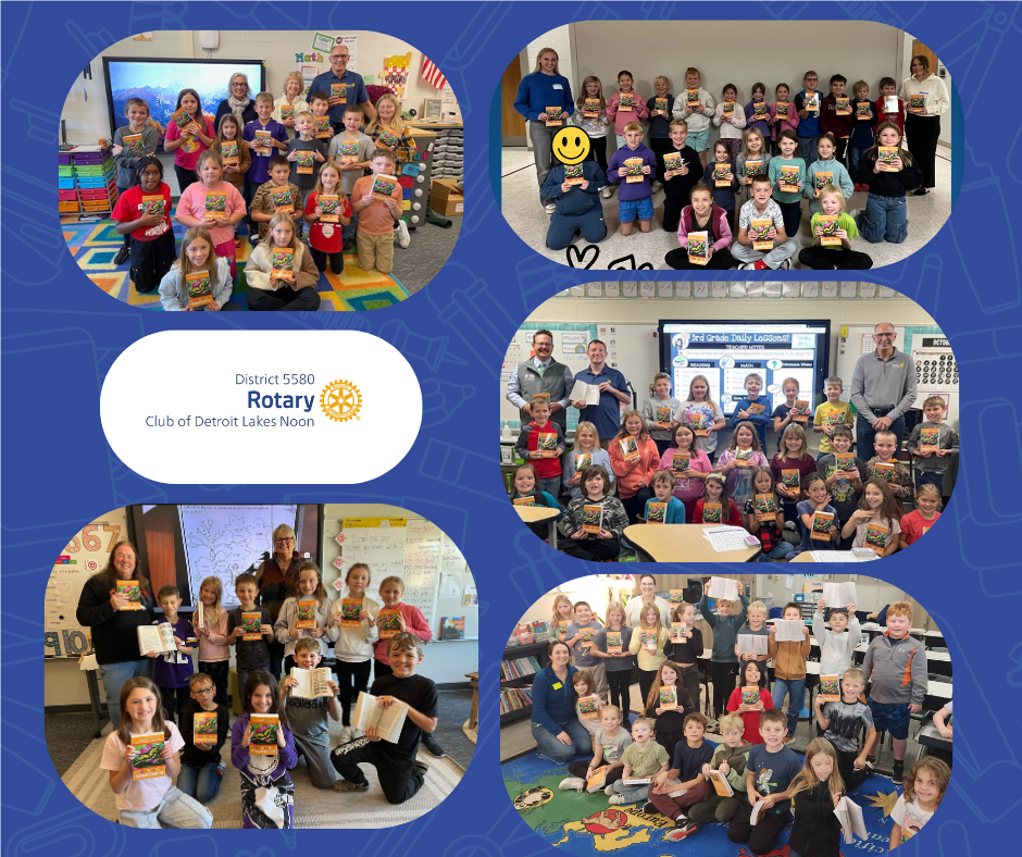 Detroit Lakes Noon Rotary successfully completed one of our cherished services projects, our annual initiative of distributing dictionaries to every third-grade student in the area. That included 9 schools and 425 dictionaries that were distributed- participating schools include Detroit Lakes' two public elementary schools, Frazee, Waubun/Ogema, Lake Park/Audubon, Circle of Life, Holy Rosary, and Faith Christian.