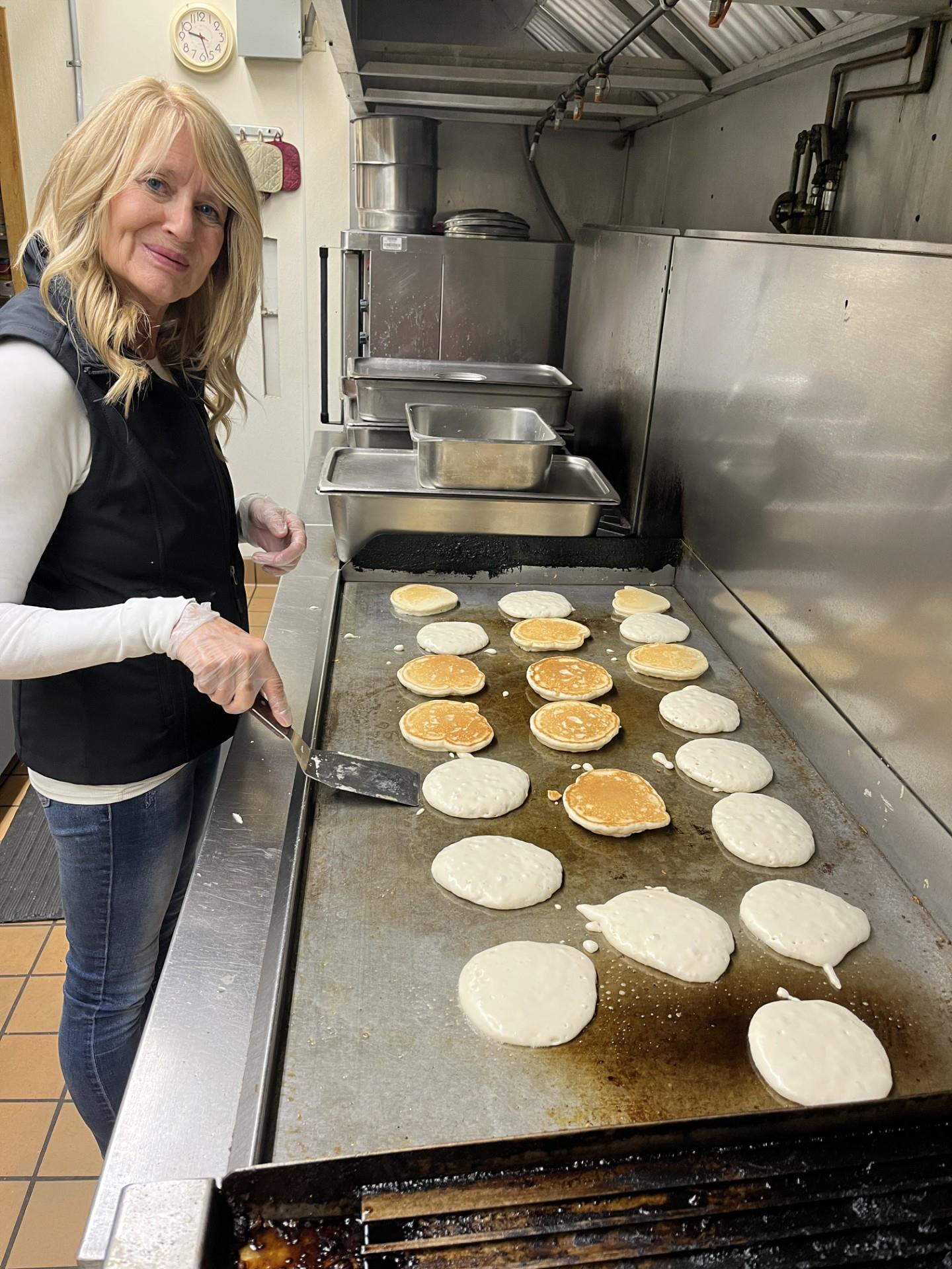 At the annual Pancake Karnival, Dickinson Rotarians took over the Eagles Club's kitchen, serving pancakes and sausage to more than 500 people in four hours and netting more than $13,000! This year's Pancake Karnival was held in memory of Past District Governor Jim Ozbun, a Dickinson Rotarian who started the event 14 years ago. The Club also held a silent auction of close to 20 donated gift baskets to boost profits. President Joy Schoch is pictured flipping pancakes.