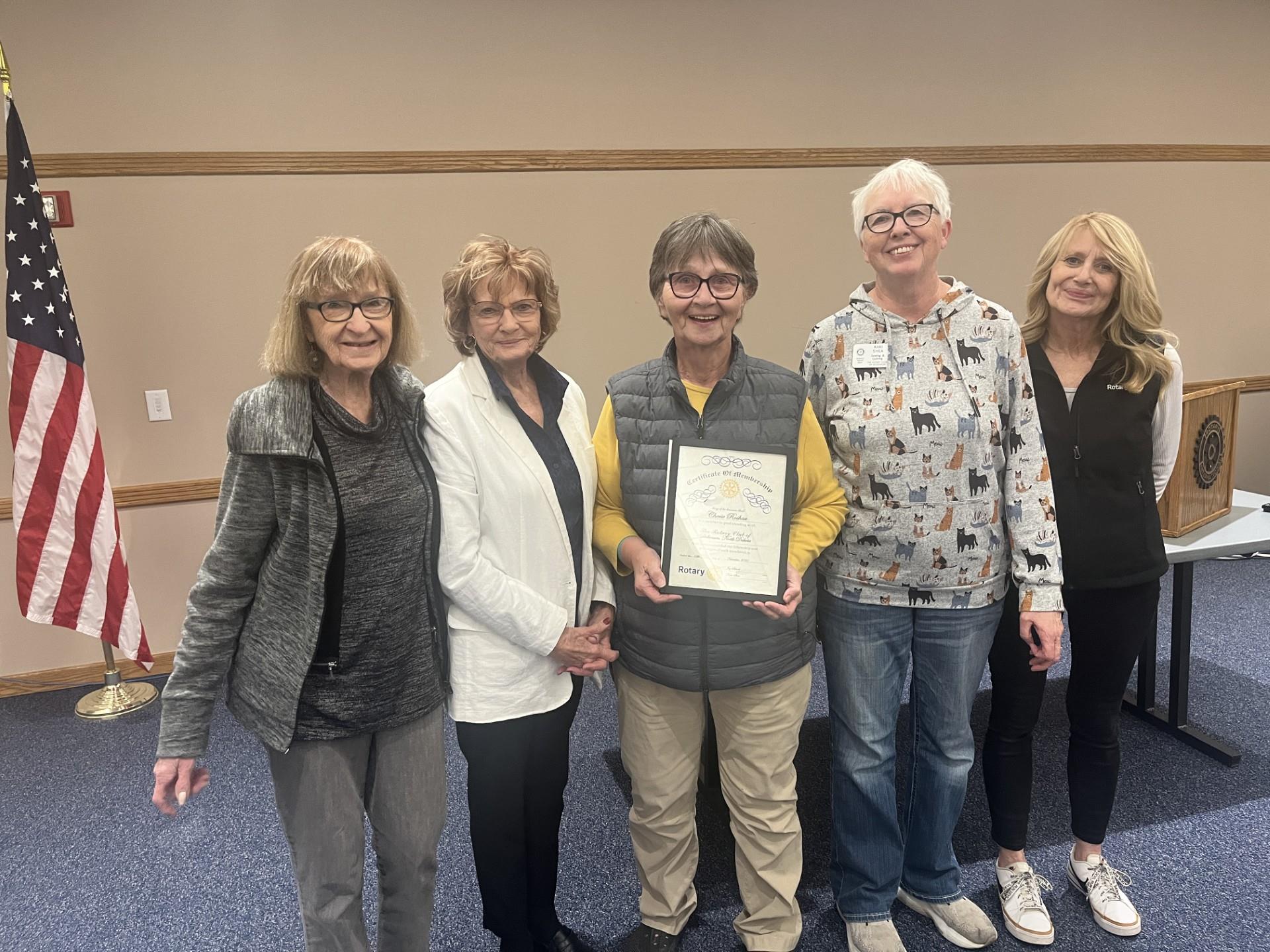 The Dickinson Rotary Club welcomes Cherie Roshau, center, as a new member. Cherie is an artist, retired teacher and vice president of the SW Art Gallery & Science Center board of directors. Cherie received her Rotary membership materials from club president Joy Schoch, far right, and club secretary Kari Shea, near right. She is sponsored for membership by Shirley Dukart, to Cherie's right, and encouraged by Irene Schafer, far left.